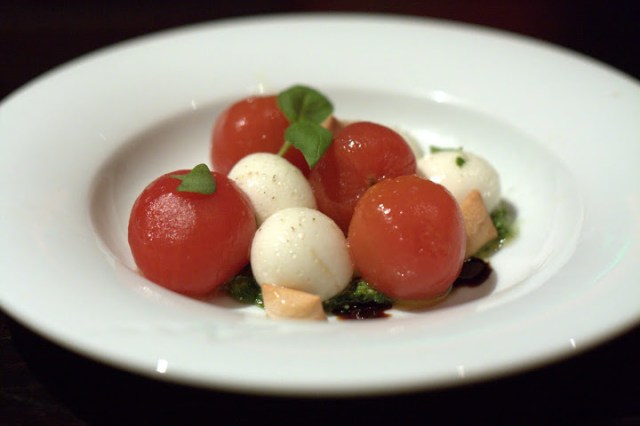 Another attempt at reinvention. I would say the reinventions are pretty clever, but somehow detract from true great flavor. The dish tasted pretty standard. Lovely ripe tomatoes with liquid mozarella encased in little sacks. I guess it was interesting having the test of mozarella explode into your mouth instead of melt like normal mozarella.