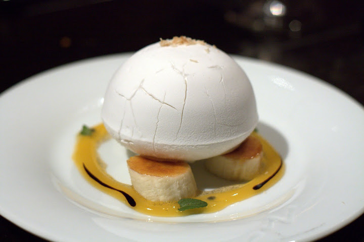 This was such an interesting and unique dessert. There were many differing tropical components that merried together very well. The nitro island was a slightly tart coconut ice cream that was frozen over with nitro. Running Man was taking time to the snap the photo, and in that time the floating island began to crack. It tasted perfectly balanced with the passion fruit puree and caramelized bananas. It was a tropical paradise on a plate.