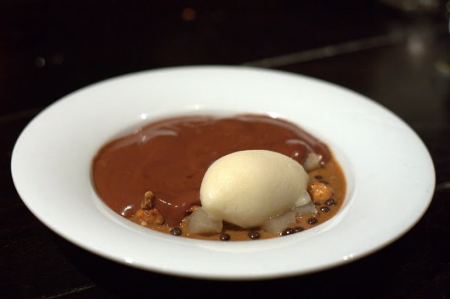 Hot Chocolate Mousse pear sorbet, salty hazelnut praline