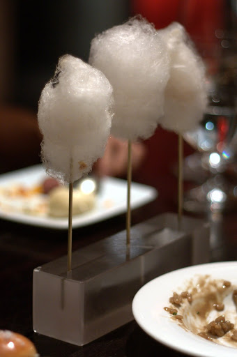 I had high hopes for this dish. All it was, was a hunk of foie gras on a stick, covered in cotton candy. Aside from the interesting concept, it tasted very simple and straightforward. Nothing crazy or interesting flavor wise. I will admit the foie gras was delicious, and subtle creamy notes seemed enhanced by the light airy sugar surrounding it.