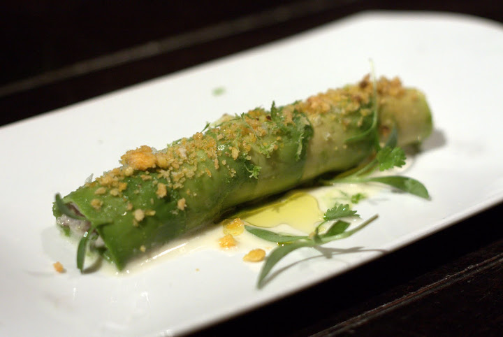 A clever play on bagel and lox using cream cheese and roe scooped into a thin cone. People raved about this one, but I just nibbled a bit since it was a small item and we didn’t order one for every one. It was hard to tell if it really tasted like a true bagel and lox since I didn’t eat the whole thing, but Smooth Obturator thought so.