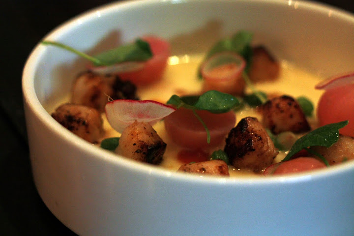 Blue Lantern Bay Scallops braised radishes, beurre blanc, fish sauce, lime skin, nasturtium
