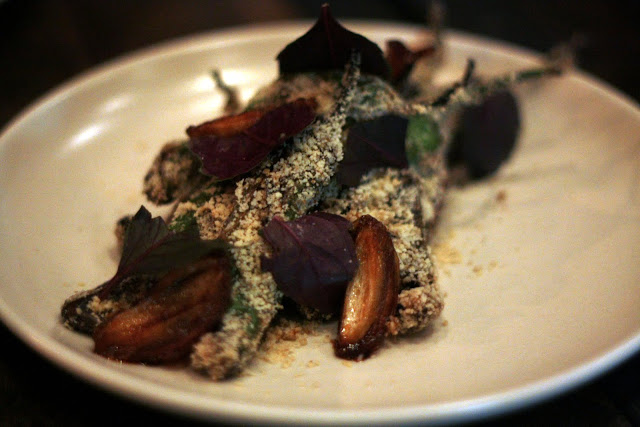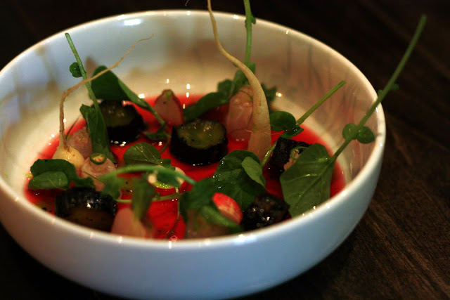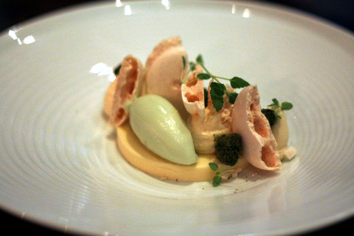 Another so so dish. I liked the flavors of the black currant and lychee but definitely did not like the powdery red stuff everywhere else. Gentian? Hyssop?