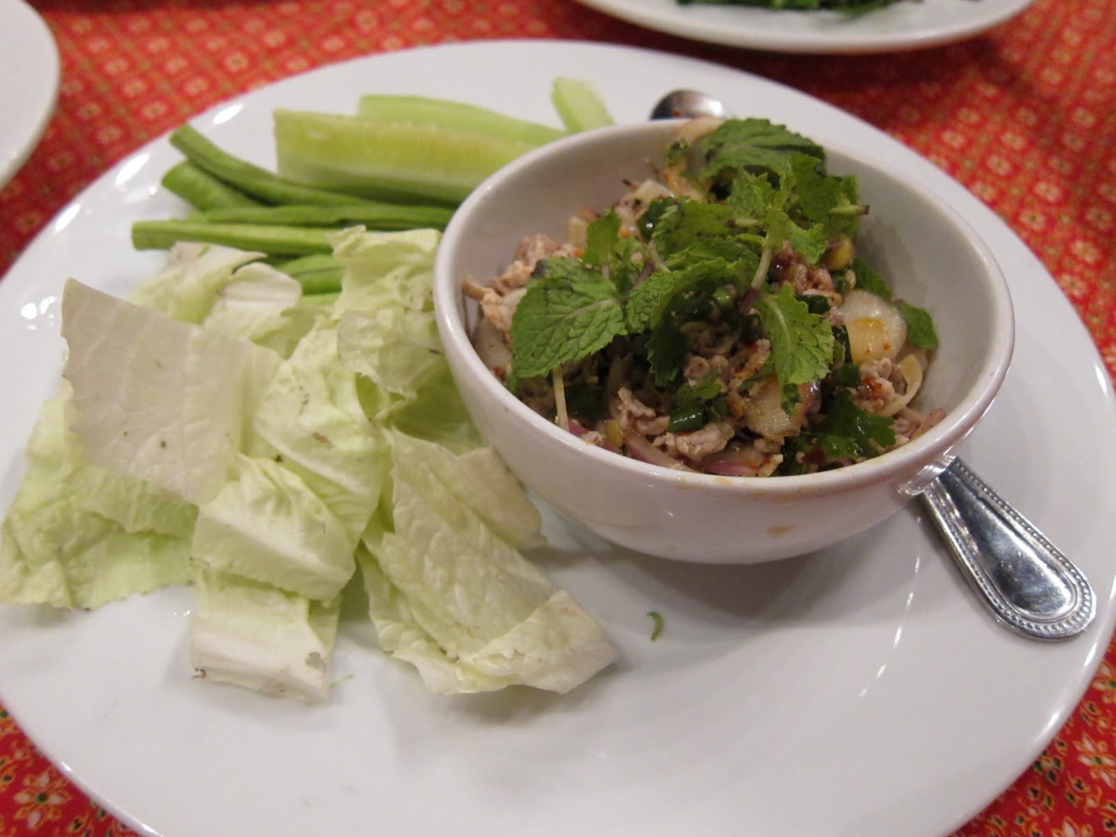 Larb Gai ground chicken, lime, chili, onions, rice powder