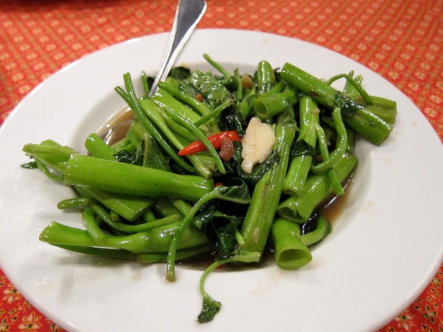Like healthy vegetable eating adults, every meal was always accompanied by a serving of stir fried morning glory. Crunchy, verdant, salty, spicy, garlicky…yum!