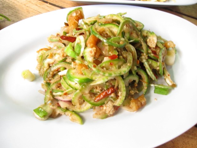 I never had this dish until I came to Chiang Mai, but it seems to be almost as popular and representative of Northen Thai cuisin as khao soi. It consists of hand made rice noodles served in a pork-tomato based curry soup. This version had plenty of blood cubes, which I did not enjoy, and ended up pushing to the side. While khao soi was dominated by a coconutty curry taste, this was marked by a deep tomato flavor which I liked a lot.