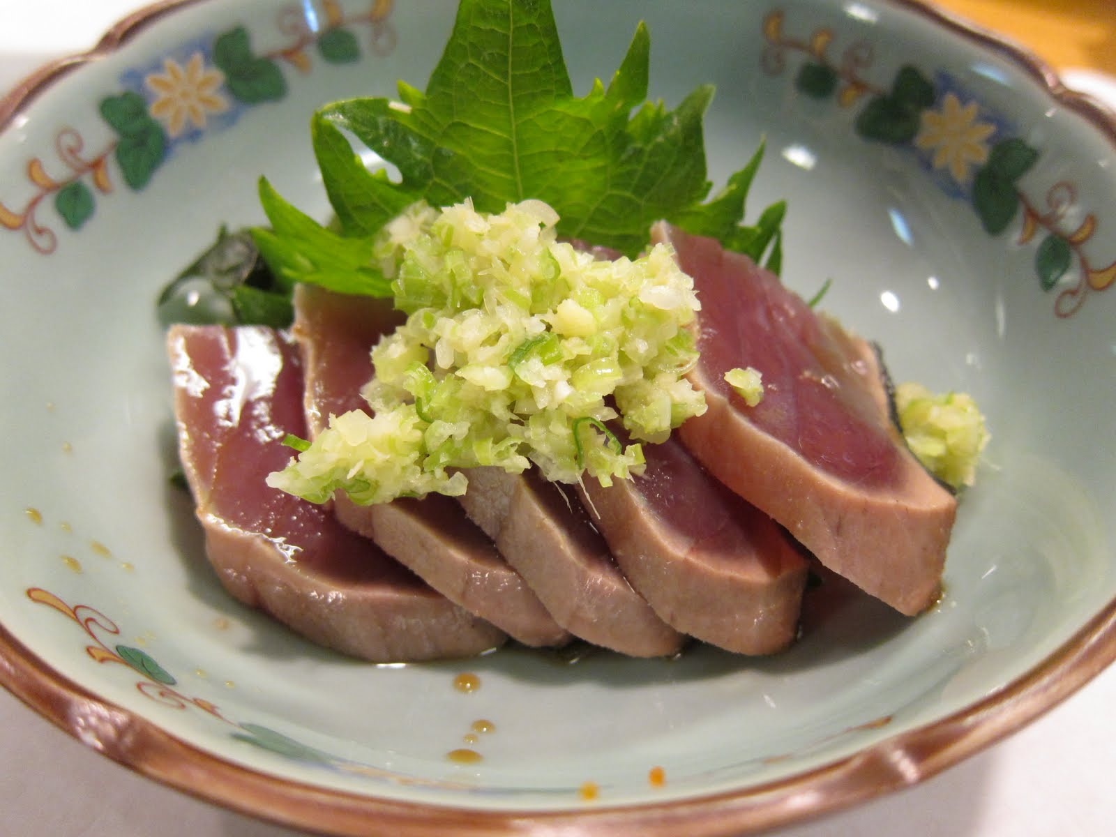 The fish was just lightly seared on the exterior and retained its rare meaty texture within. There was only a light drizzle of ponzu. The added finely chopped ginger and scallions on top brought out some nice flavor to the fish and cut the fishiness of the bonito which apparently is in the mackerel family.