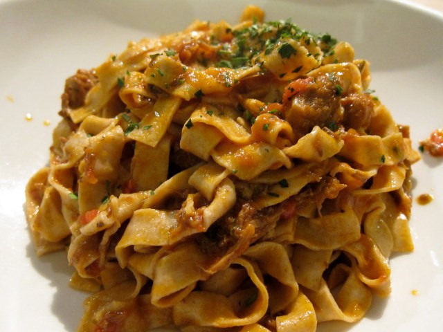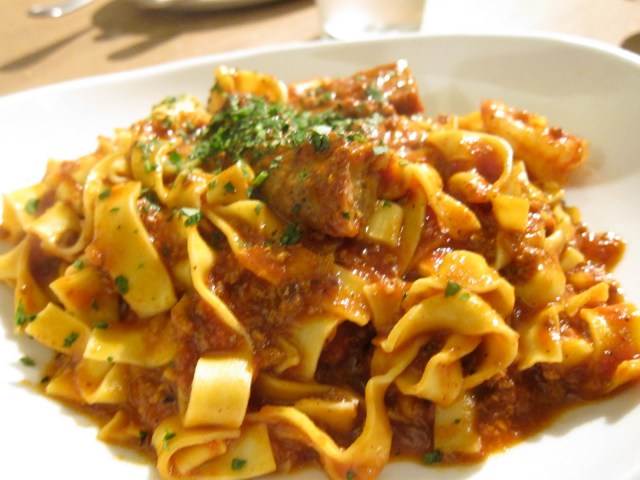 Tagliatelle Salcicia hand cut fettuccine with sausage in spicy tomato sauce