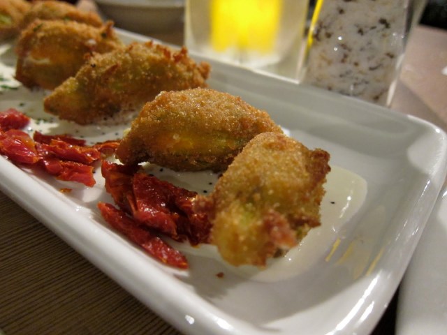 I’ve never actually tried zucchini blossoms before, but who knew a flower could be so tasty? I guess anything that’s fried and breaded will be delicious, but the creamy mixture of cheeses used to stuff this little guys made for a winning combination. The side servings of sun dried tomatoes added great contrast of flavor.