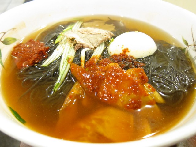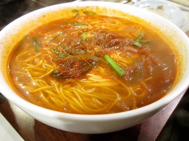 It’s a good thing everyone at my table spoke Mandarin, from The Communist, The Bottomless Pit, to Bubble Bear and her hubby. Soprano Man and I got to play dumb as everything was conveniently ordered for us. Speaking the language didn’t help much in the translation department. I got tired of eating meat skewer after meat skewer so we decided to venture out and get some noodles. Our choices were “hot noodles” and “cold noodles” with no further descriptions beyond that. I was hungry and The Bottomless Pit rarely ever says no, so we took a gamble and ordered one of each, hoping for the best.