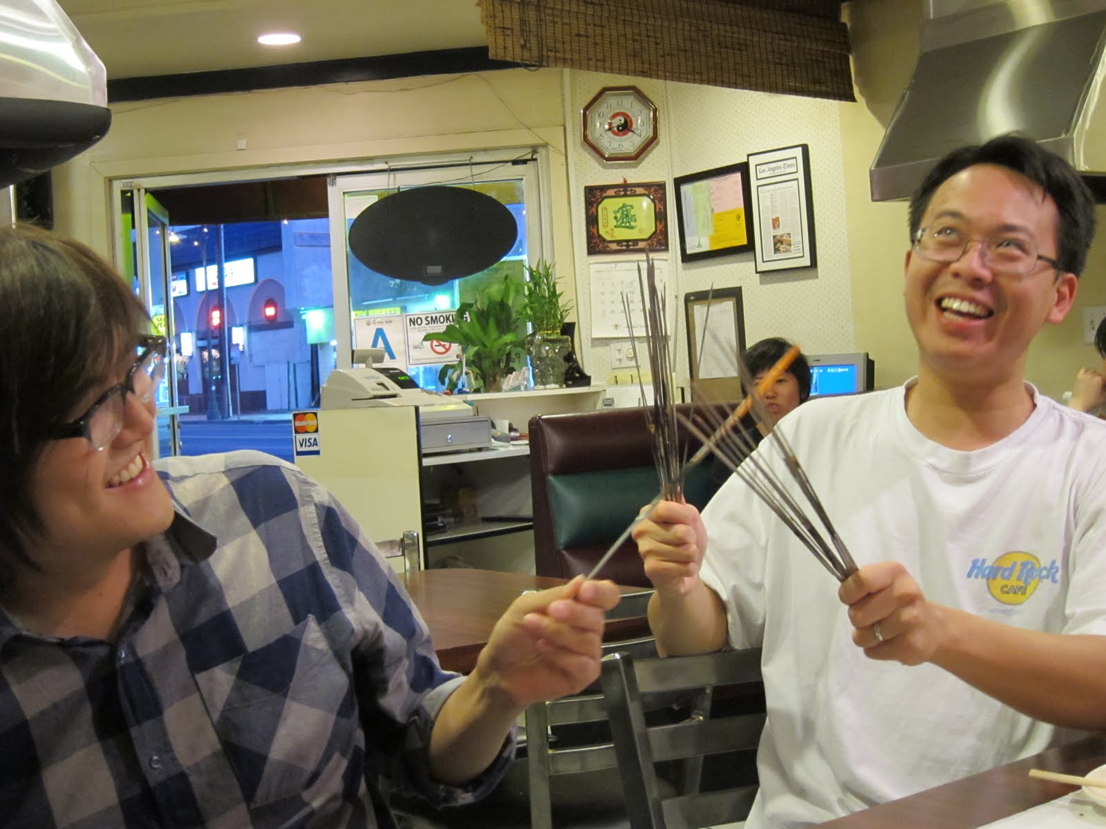 Feng Mao was certainly a different experience for me. I’d never eaten meat like that before. It was really fun and pretty satisfying. I will admit its pretty boring to eat just meat skewers with not a lot of different banchan or dipping sauces to enhance the experience. But after all the other added dishes, I felt the meal was rounded out nicely. The place also offers up an array of other Chinese dishes, shredded pork and garlic sauce, eggplant in brown sauce, etc etc. Luckily we came at a good time because when we left around 9pm there was quite a wait. Unfortunately the place has less than 10 tables and they’re all sized for parties of 4-6 or more, so it kinda sucks if you’re a party of 2 occupying a table that could fit 6. There’s only 1 grill per table so you can’t really split a table. Anyways, the place is pretty popular so don’t come too late, but there is a 2nd location in Ktown. I recommend this place if you’re tired of the same old boring Korean bbq. Think of it as Chinese/Middle Eastern bbq served up in Ktown by Chinese-Koreans. Don’t you love the clash of cultures? Only in LA!