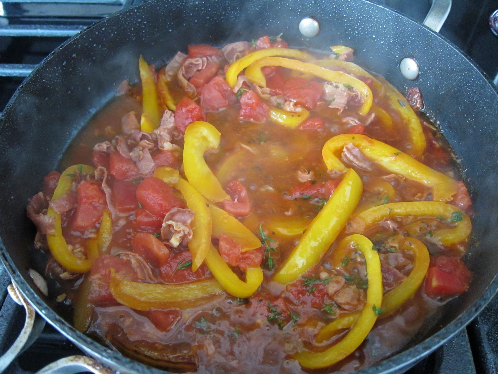 Keeping the same pan over medium heat, add the peppers and prosciutto and cook until the peppers have browned and the prosciutto is crisp, about 5 minutes. Add the garlic and cook for 1 minute. Add the tomatoes, wine, and herbs. Using a wooden spoon, scrape the browned bits off the bottom of the pan. Return the chicken to the pan, add the stock, and bring the mixture to a boil. Reduce the heat and simmer, covered, until the chicken is cooked through, about 20 to 30 minutes.