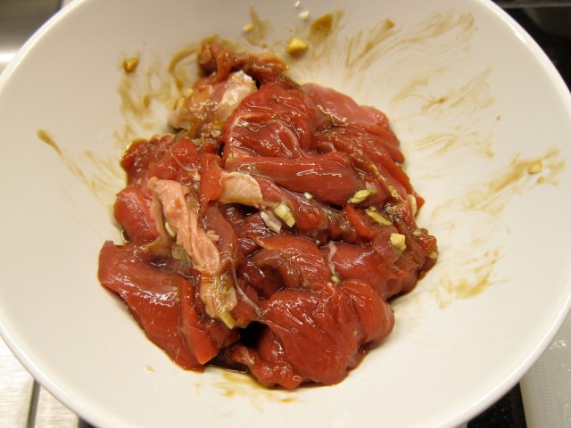 Here I just take a cut of flank steak, sliced up into strips, marinate it in some oyster sauce and garlic.