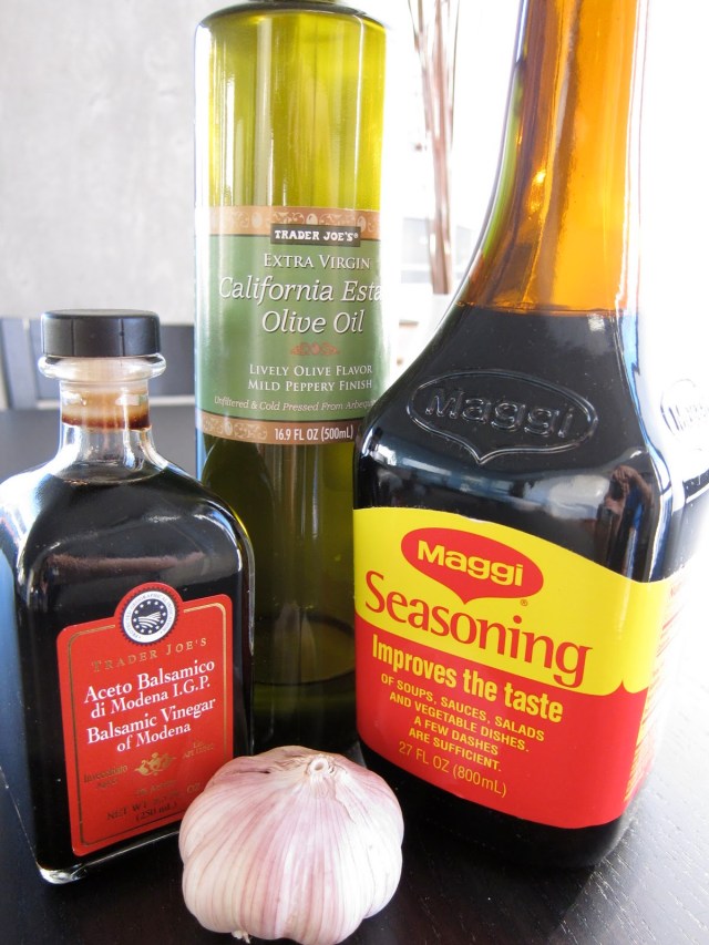 Another key to this salad is the dressing. I’m not sure how my mom came up with this. Maybe it’s a very common dressing eaten in other homes. I know I just love it. I recently bought this brand of balsamic vinegar at Trader Joe’s and I love it. It has a very rounded, slighly sweet taste. The Maggi is key, but perhaps can be replaced with regular soy sauce, but I’ve never tried. Maggi just has a special taste to it that I grew up on.