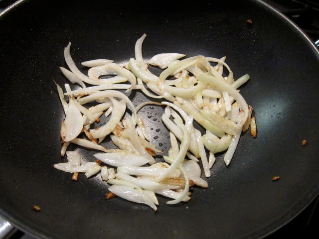 5. After onions get some good color, add beef and stir fry on high heat. Cook steak to your preference, I go for medium to medium rare.