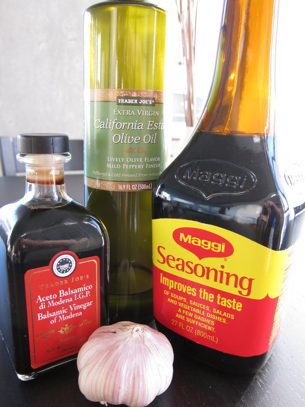 Another key to this salad is the dressing. I’m not sure how my mom came up with this. Maybe it’s a very common dressing eaten in other homes. I know I just love it. I recently bought this brand of balsamic vinegar at Trader Joe’s and I love it. It has a very rounded, slighly sweet taste. The Maggi is key, but perhaps can be replaced with regular soy sauce, but I’ve never tried. Maggi just has a special taste to it that I grew up on.