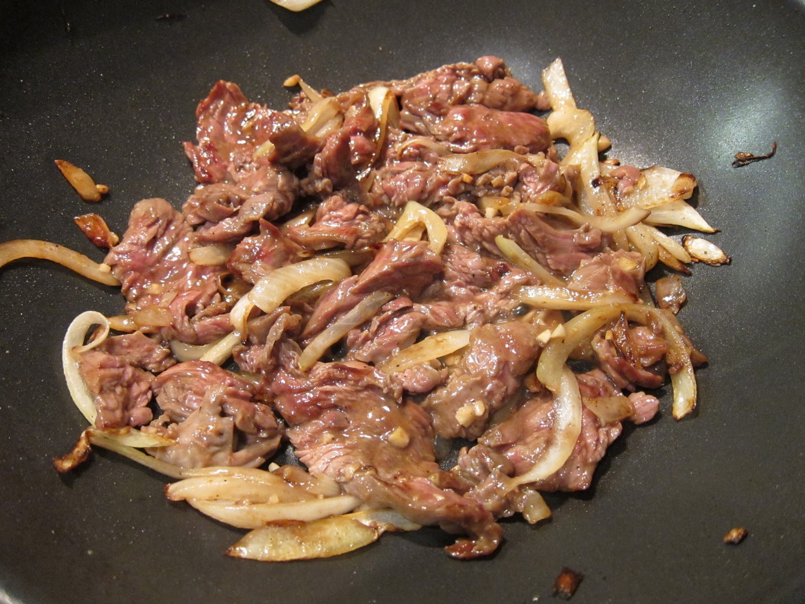 5. After onions get some good color, add beef and stir fry on high heat. Cook steak to your preference, I go for medium to medium rare.