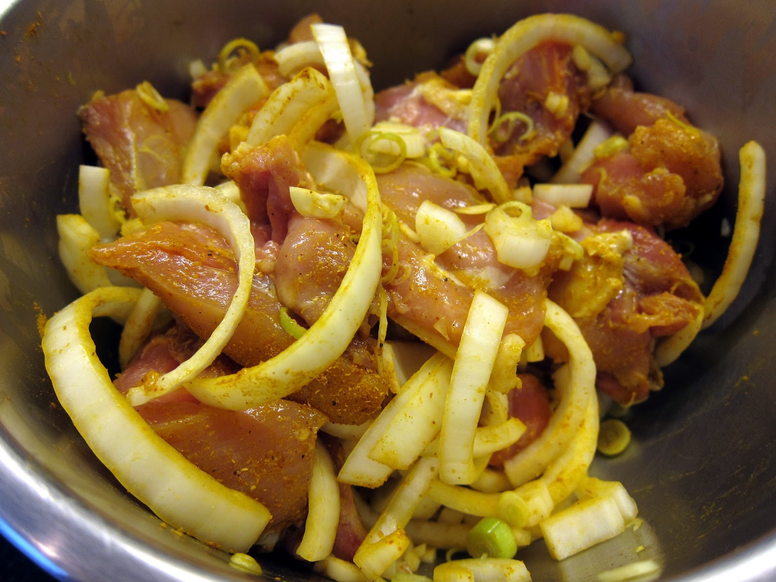 First you gotta marinate your meat. I like to keep my meat in semi-large pieces so that they end up being fall apart tender after a while. Unfortunately, it takes longer to cook that way.