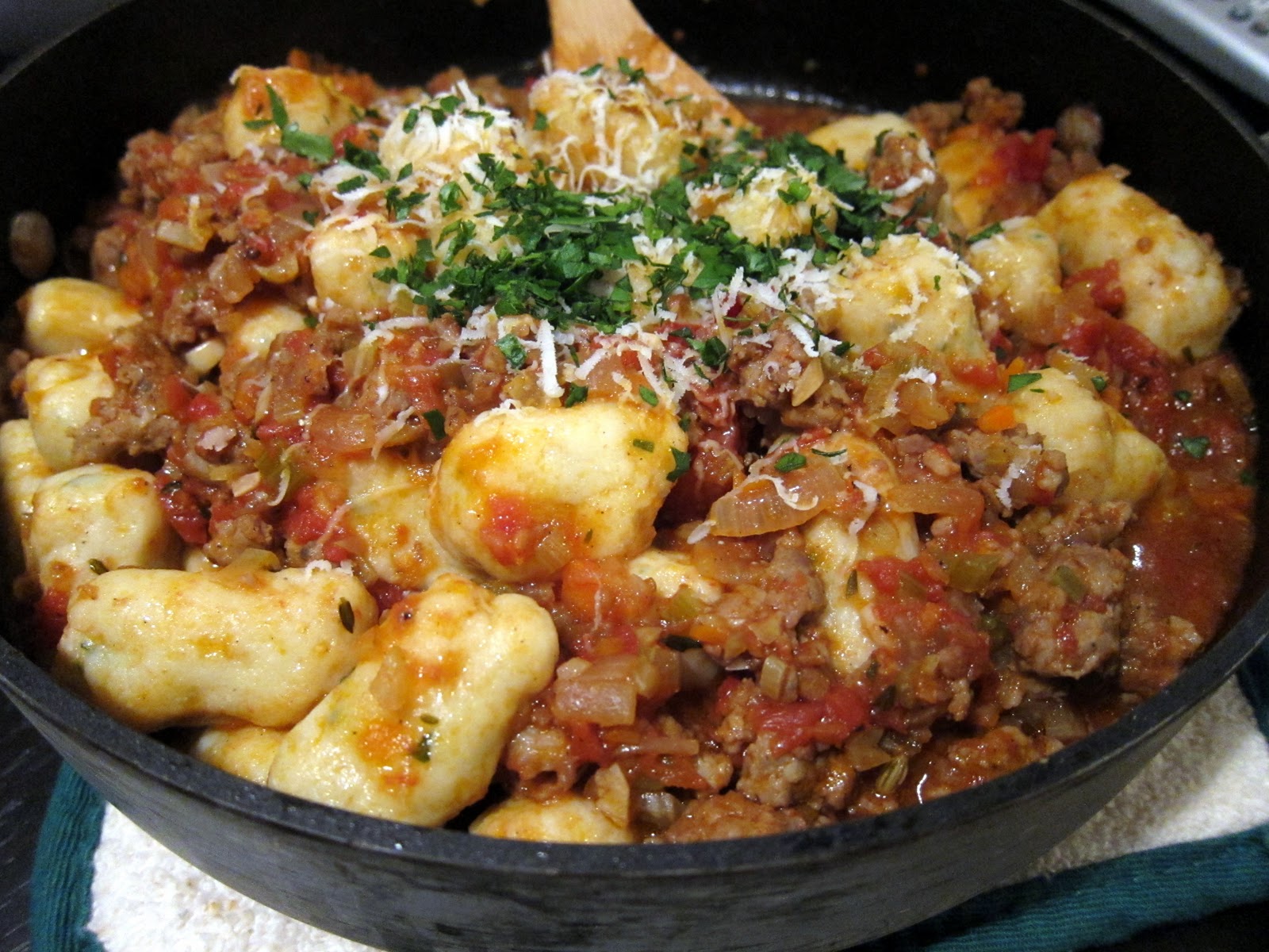 In a heavy-bottomed pan, cook the sausage over high heat until it begins to brown in its own fat. Add half of the fennel seeds and chile flakes. Remove the sausage from the pan when cooked through and add the onions, fennel, carrots, celery and garlic. Cook the vegetables until they’re well browned and return the sausage to the pan. Add the tomato sauce and remaining fennel seeds and chile flakes. Simmer 1/2 hour, until vegetables and sausage are very tender. Season well with salt and pepper. Meanwhile, bring 6 quarts of water to a boil and add 2 tablespoons salt. Gently slip as many gnocchi at a time as will float freely into a pot of boiling water, stirring gently with a wooden spoon as you do. Cook until the gnocchi rise to the surface, about 7 minutes. (Test 1 for doneness by cutting into the center; the gnocchi should be the same color and consistency all the way through.) Scoop them out with a wire skimmer as soon as they are cooked. Drain and add to the pan with the hot ragu, tossing gently 1 minute to coat. Top with Pecorino Romano and serve immediately.