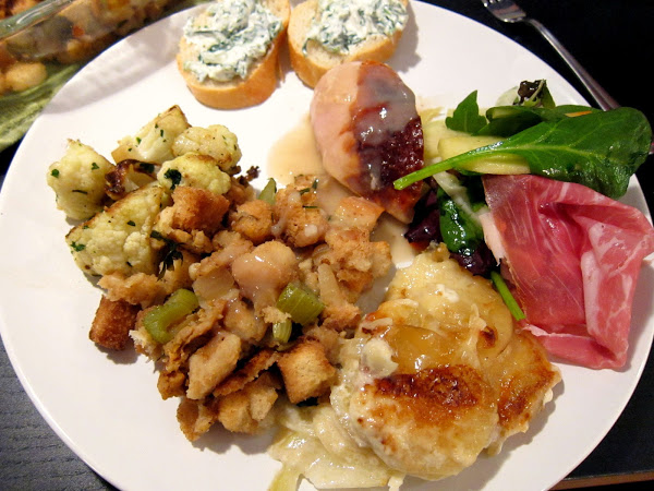 So my mom has become sort of a traveling gnome these days. She plans these elaborate trips, it’s beginning to feel like every years now, with all her lady friends to quite exotic destinations. This year it was Turkey and Sri Lanka with a short jaunt to Vietnam. She often goes in the fall and this year she happened to be gone during Thanksgiving. With her gone, my siblings and I were sort of at a loss of what to do. In the end, everyone else decided to take a trip too. Triple F and Running Man went to South America and Smooth Obturator and Triple T went to Bora Bora. By the time I thought of going back home to spend Thanksgiving with Dumpling Man’s family, plane tickets were through the roof. So that left Dumpling Man and me, alone, in rainy Portland for Thanksgiving. Luckily, Zhu Zhu Hamster was also in town and she brought along her friend, Little Pet. So I took this opportunity to attempt my first Thanksgiving dinner for 4. I didn’t make all the usual things I normally eat with my family. The only thing I really missed out on was the Oyster and Shrimp Stuffing which I have been eating with my family for as long as I could remember. Dumpling Man very much dislikes my family’s stuffing so I tried to do a more normal one this year. All the recipes I used this year came from trusty foodtv.com.