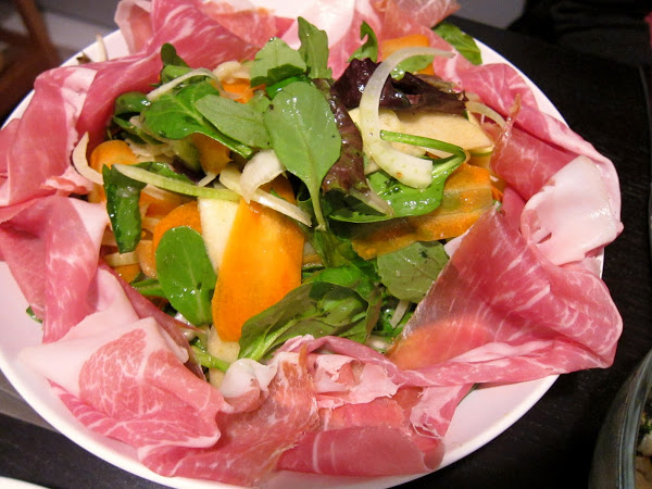 Fennel, Apple, Shaved Carrot Salad candied walnuts, truffle lemon vinaigrette, prosciutto di parma