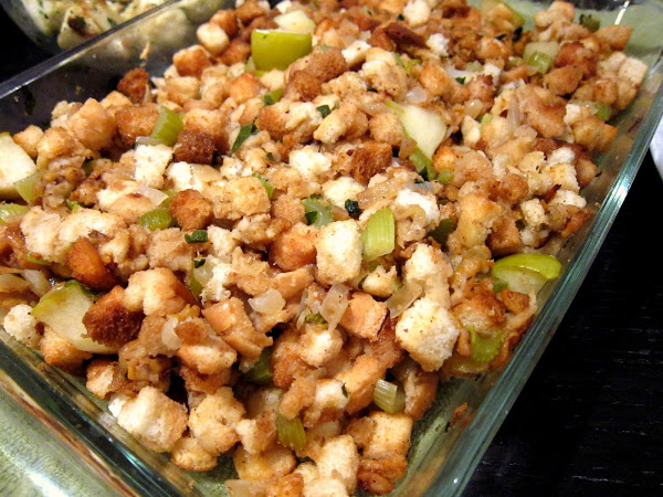 I’ll have to admit I was pretty disappointed and ashamed to serve this. It was quite blah. Of course, Ina Garten’s recipe calls for using real bread as do most of the other stuffing recipes on foodtv.com. I’m not used to using real bread. I’m used to using the stuff that comes out of the box. I really like the texture of boxed stuffing and I don’t know any different. I know Dumpling Man feels the same, so I didnt want to rock the boat too much on this first Thanksgiving. So I attempted to take the middle ground and use unseasoned croutons instead of the seasoned Mrs. Cubbison’s, wanting to add my own flavors with all the herbs called for in the recipe. The herbs and vegetables just didn’t seem to come together with the bread. I kept adding more stock hoping it would all meld, but it didn’t. It wasn’t even dry either. I’m gonna have to re-make this one using Mrs. Cubbison’s to see if that makes a difference.