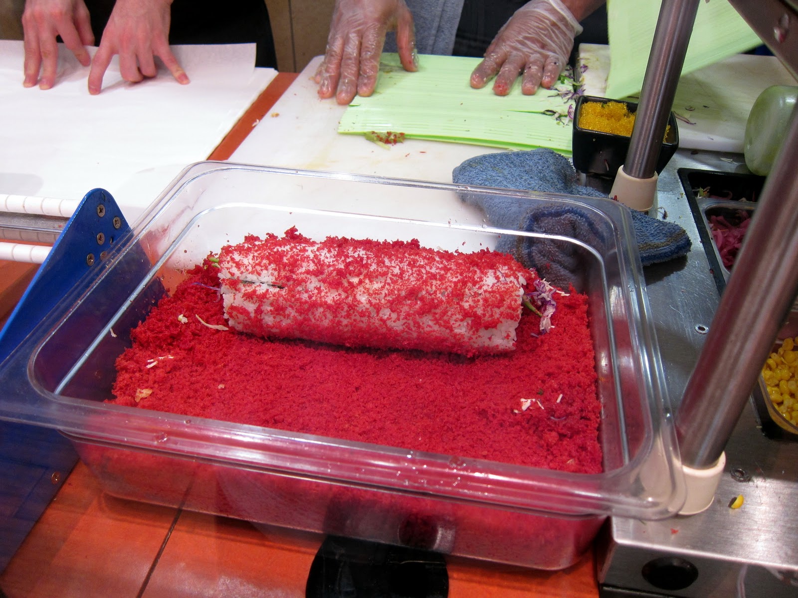 After your sushiritto is made, it’s rolled in roe, just like a sushi roll would be.
