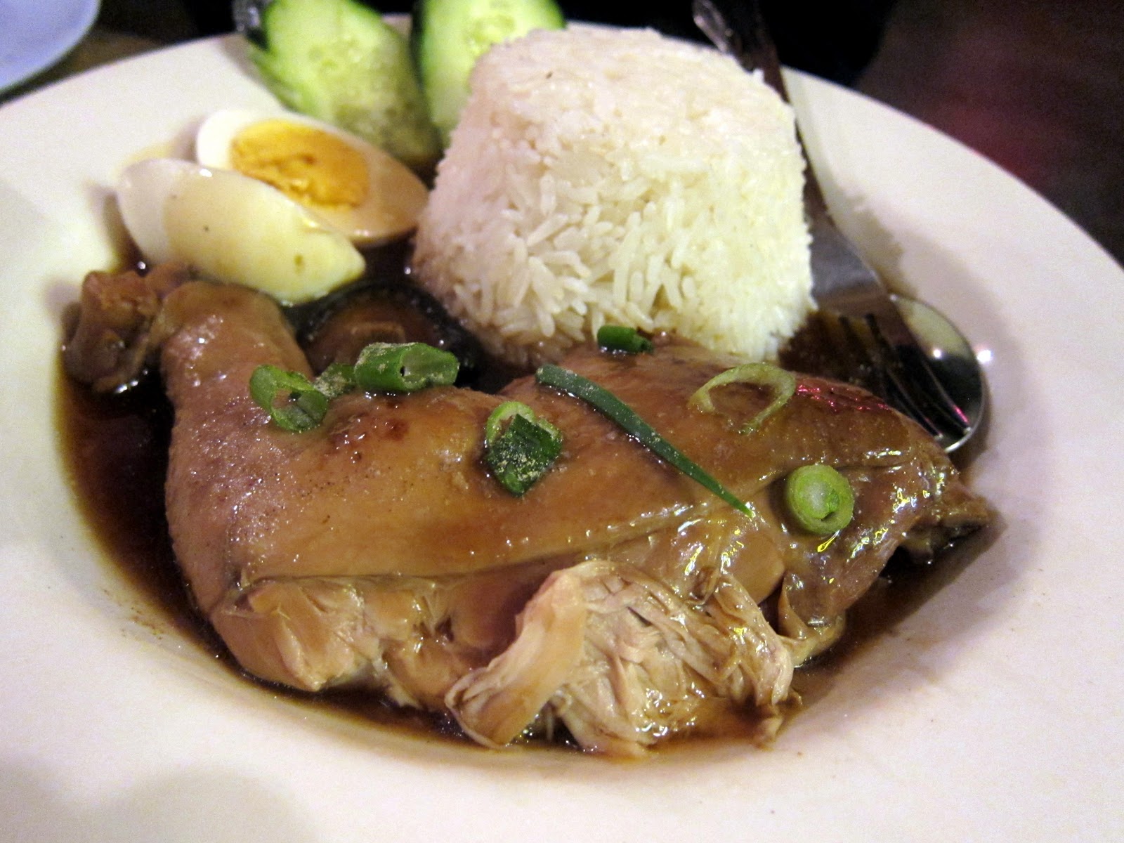 Khao Mon Gai Thoon Kai Tom stewed chicken in five spices, soy, hard boiled egg, black mushrooms, topped with gravy