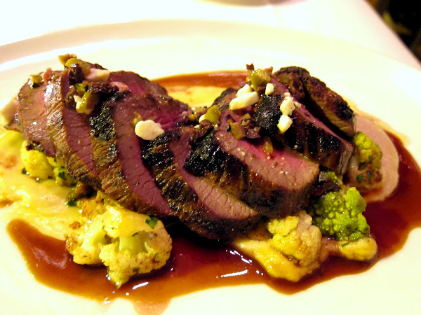 Grilled Sudan Farms Lamb Leg caramelized cauliflower, romanesco, black-olive feta tapenade
