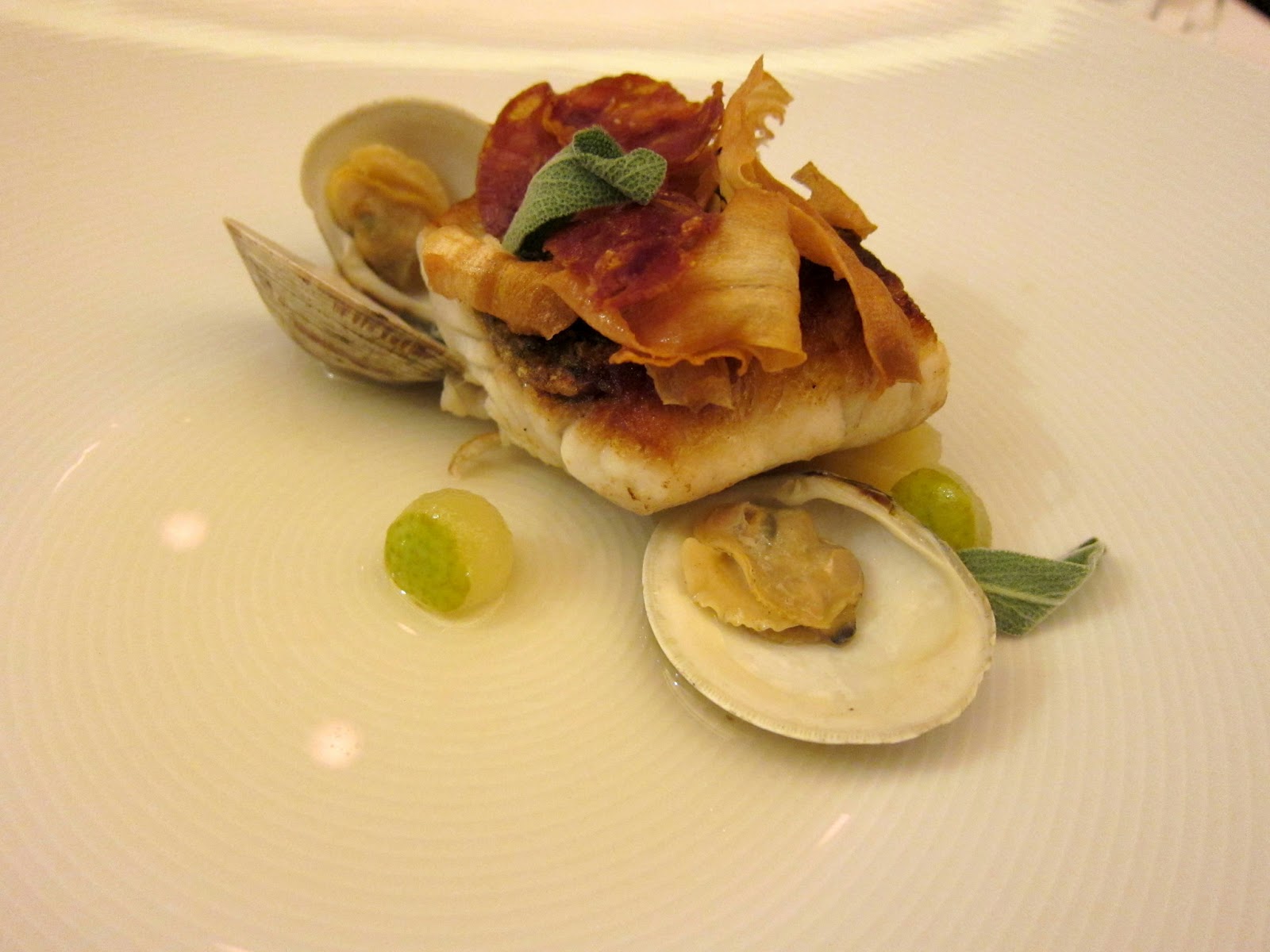The fish was well cooked. The clams added little. The chorizo was incredibly dry. The pear was so out of place. The sage?