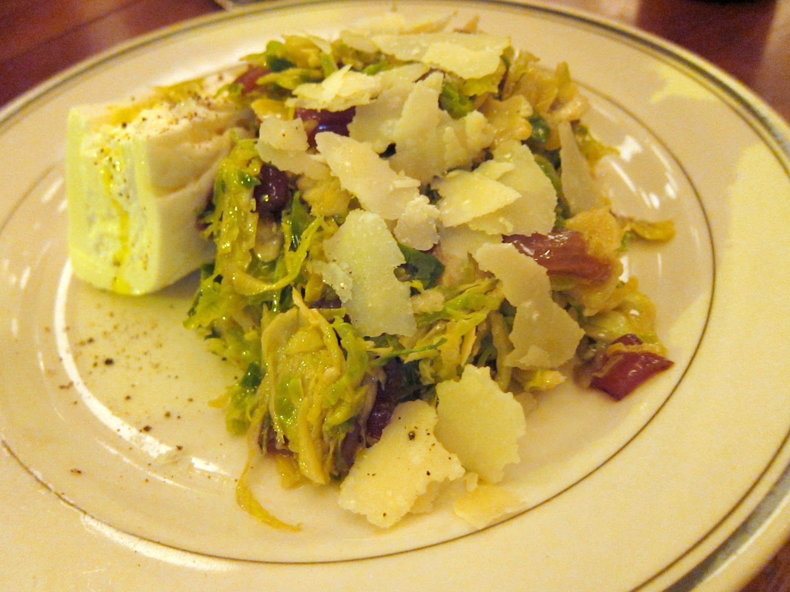 Shaved Brussels Sprouts Salad with Burrata shaved parmesan, red onions, lemon shallot vinaigrette