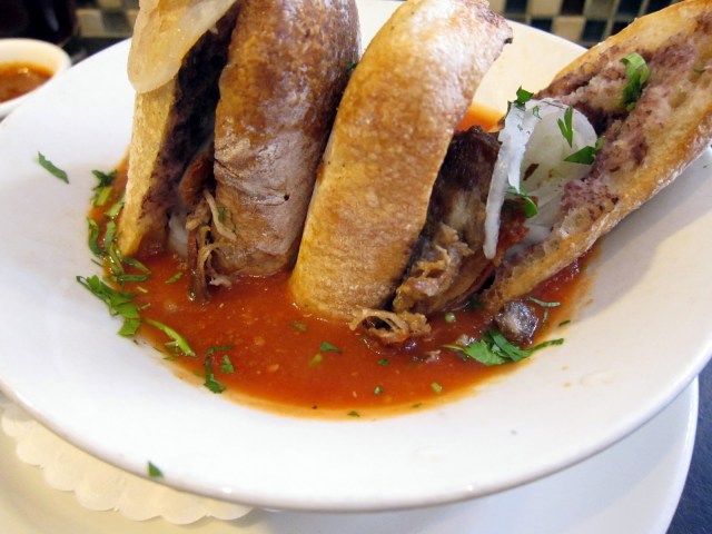 I really liked my choice. The carnitas were shredded and tender with a good amount of caramelization of seasoning on the exterior pieces. The whole sandwhich was dunked in this spicy tomato sauce/broth. So each bite was juicy from the meat and soaked in tomato broth. It was one delicious bite after the next. I could not finish it.