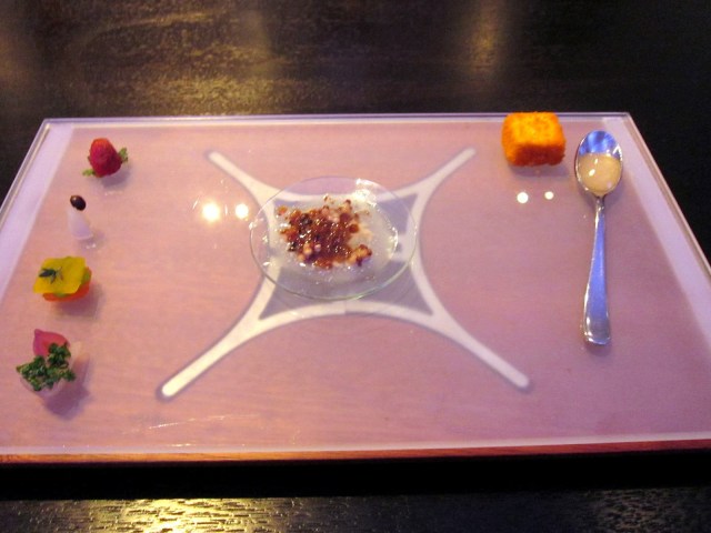 Don’t be fooled. There’s no oyster here, just a leaf that was supposed to taste like an oyster coated in a traditional mignonette. Ehh, I didn’t really get much of that here. I was moving on to the next bite, I mean course, hoping for something better.