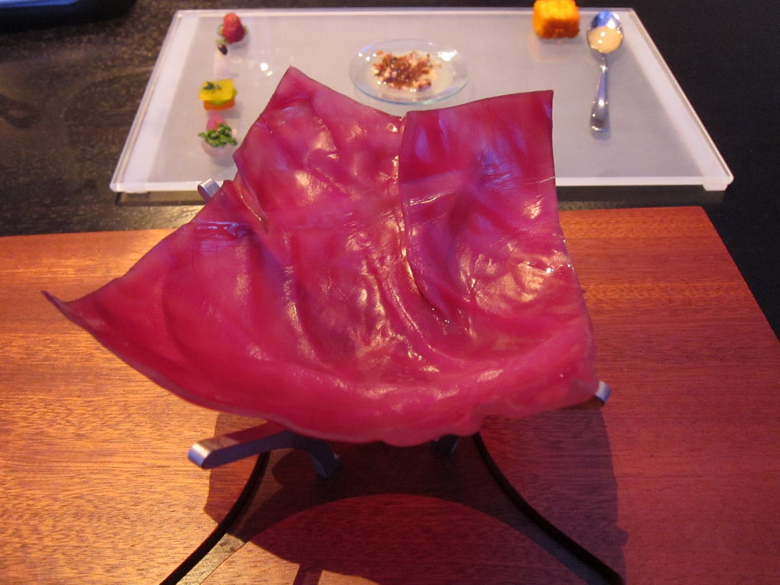 The next course had many components to it, none of which seemed to have any rhyme or reason until put in your mouth. First there was some complicated contraption upon which this piece of red cabbage was placed. The cabbage was marinated in red wine and cinnamon. Imagine taking cabbage and making it into a fruit roll up with a tad too much cinnamon. I guess that doesn’t sound appealing, but the cabbage was more of a vehicle for everything else to follow.