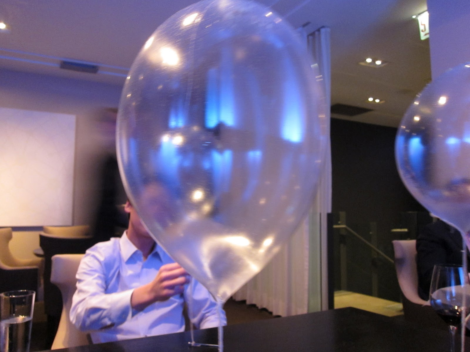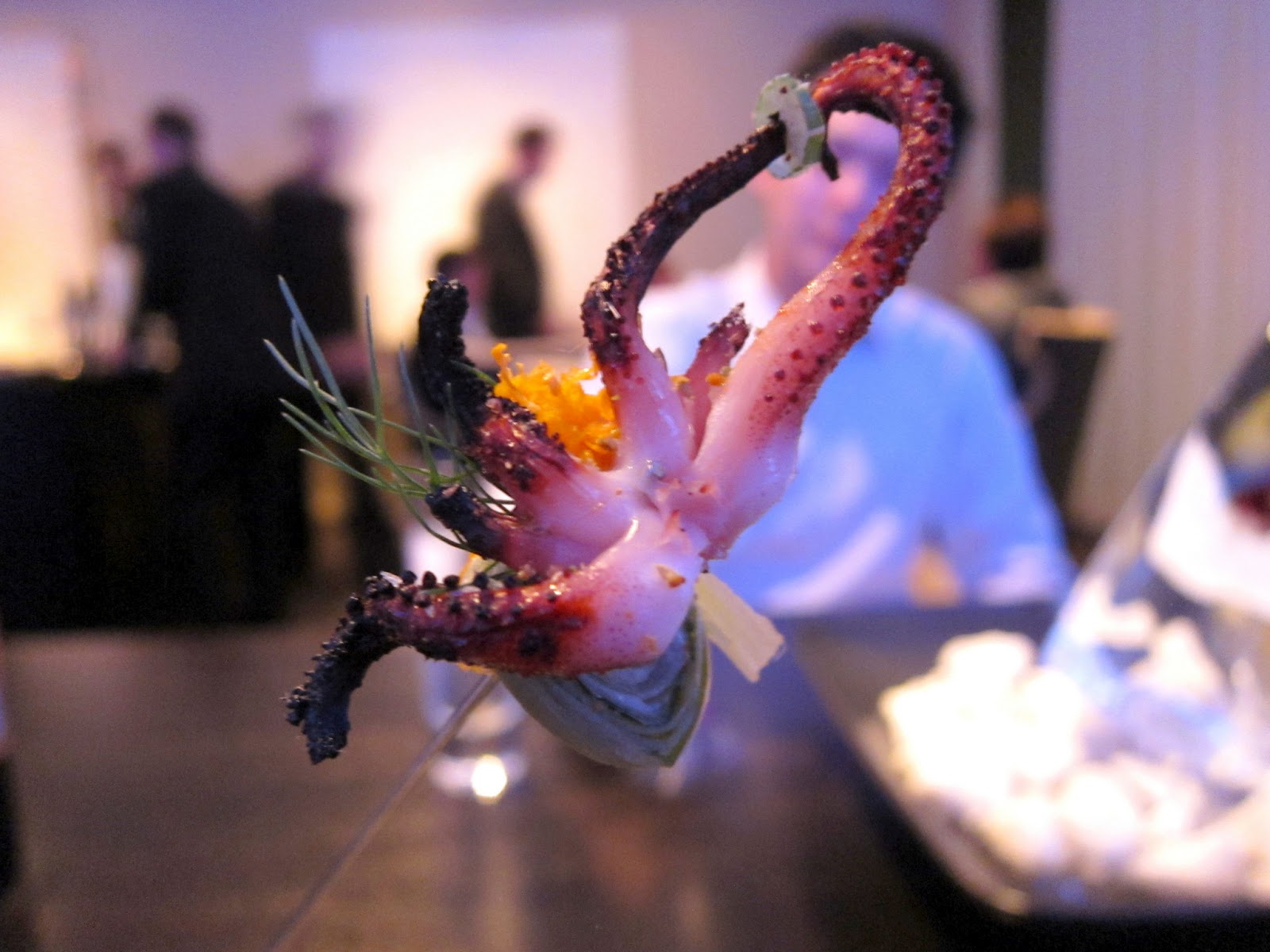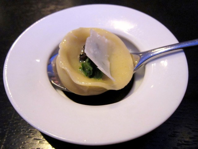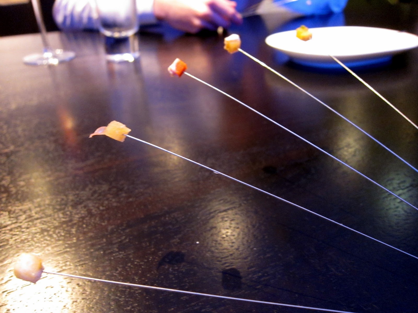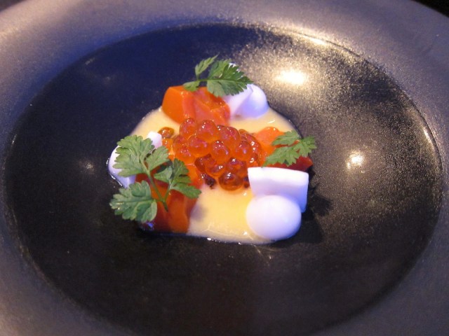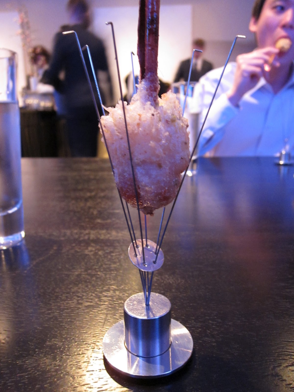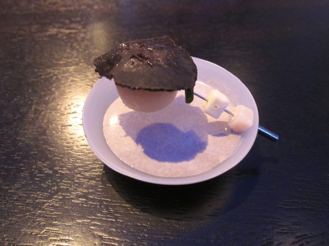 Our next course was described as “time and temperature sensitive.” It was a hot potato ball filled with cold potato soup. It was a truffly buttery bite. Yum! Ho Bag kept saying “oh that’s good…this is good…”