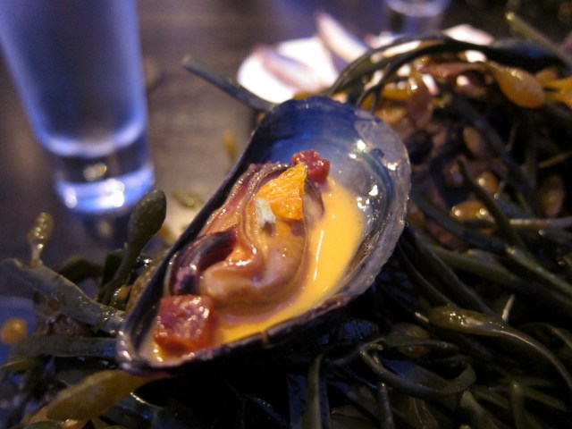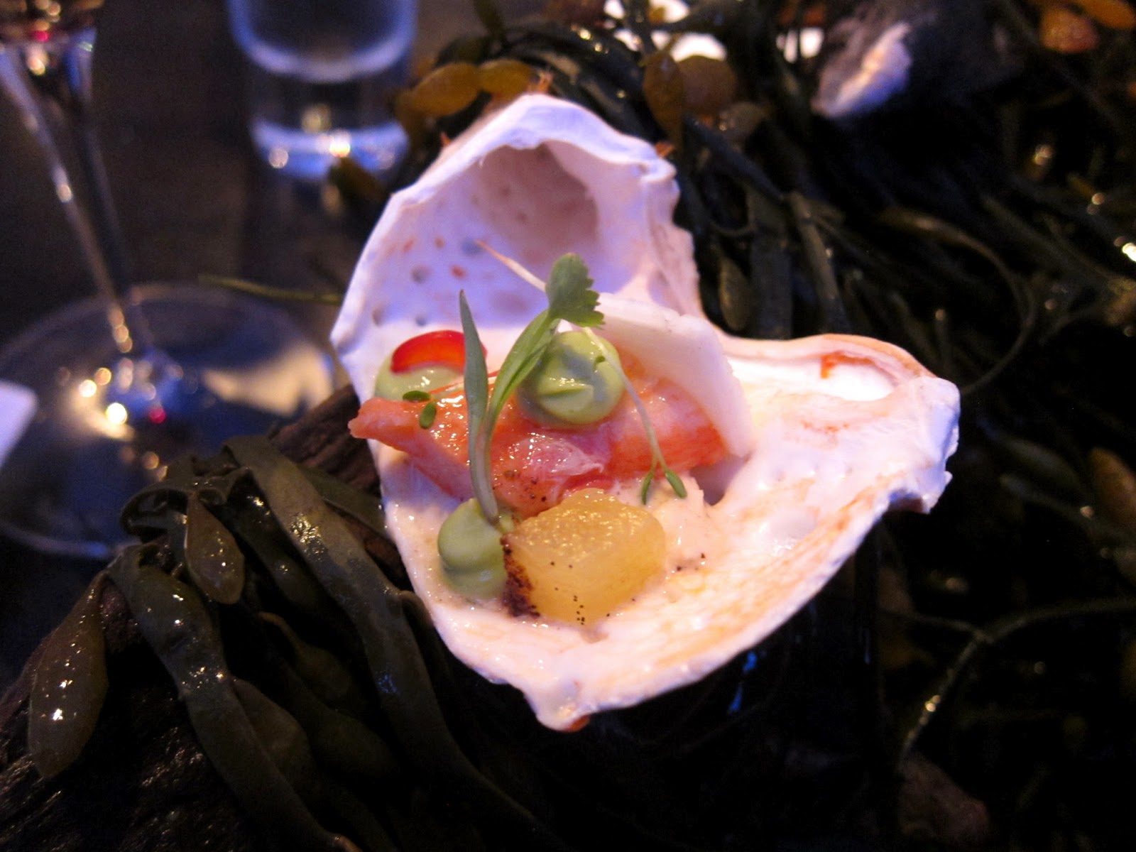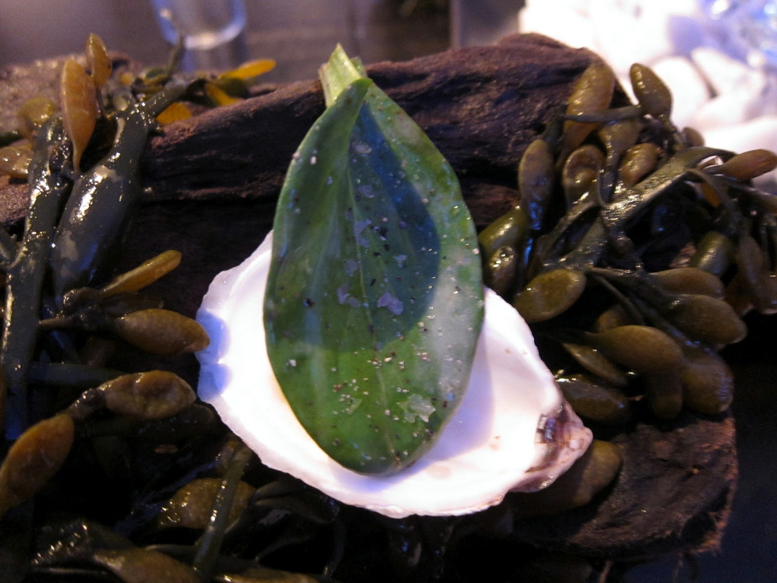 The next series of course was presented as a “tasting of the ocean” and was presented on a piece of driftwood draped in real seaweed, the real ugly kind that floats in the ocean.