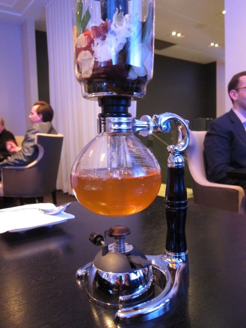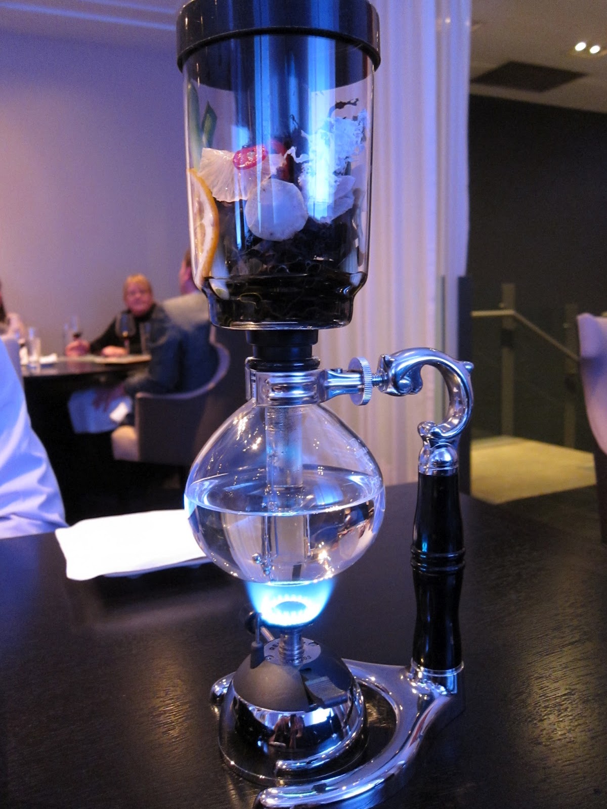 The waiters love bringing or leaving shit on your table and not explaining what purpose it serves. Later on we found it that this is a siphon brewer filled with seaweed, bonito flakes, yuzu, ginger, soy powder, and mirin. Does anybody know what that spells? Yes, DASHI.