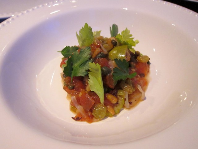 The caponata really brought some brightness and freshness. It was made of fried eggplants, pine nuts, golden raisins tomatoes, and cocoa powder of all things. I can’t say I tasted much of the cocoa powder. I couldn’t get enough of this since I love anything tomato-ey. Overall, this was probably the most “normal” course for the night.