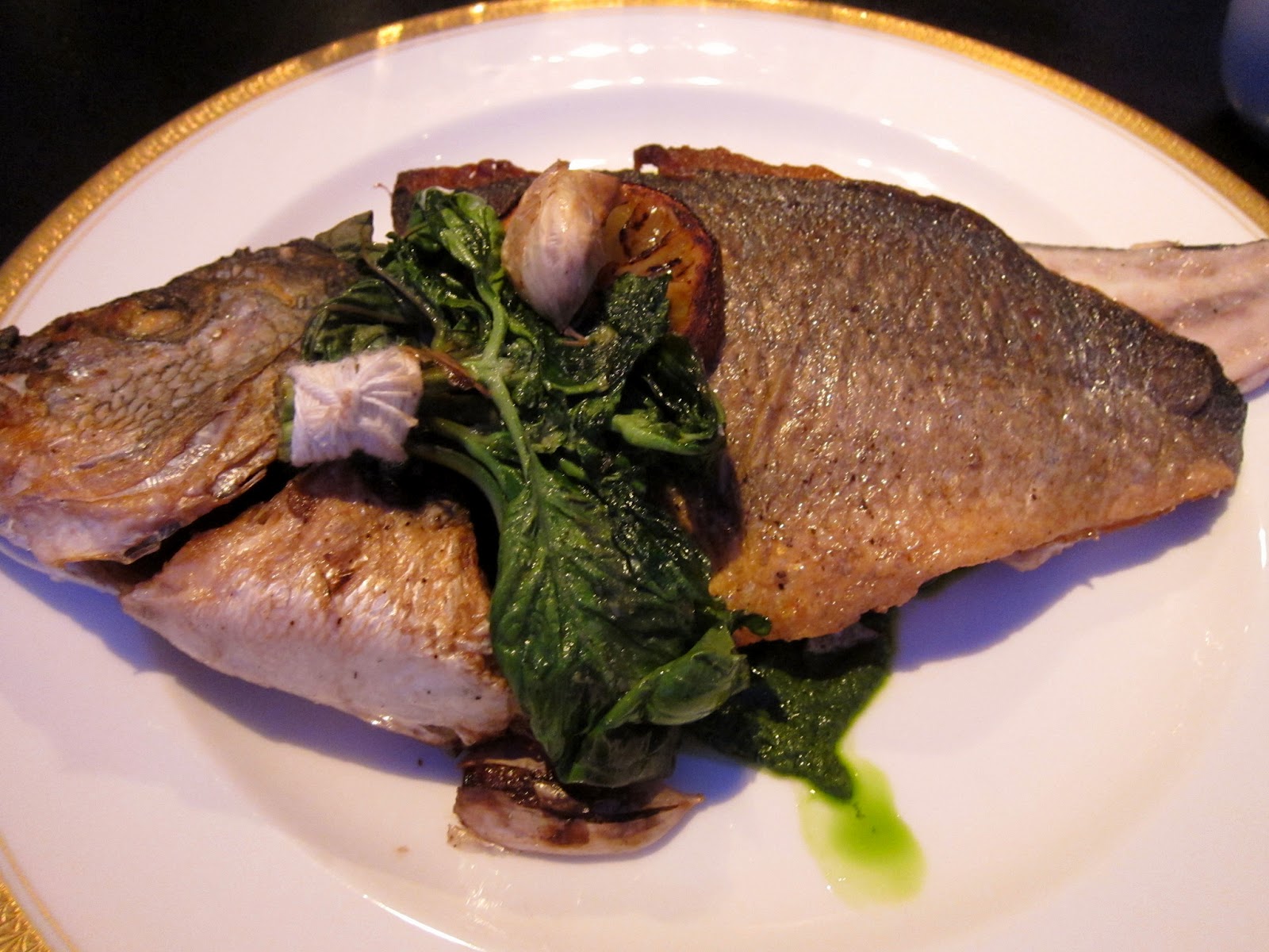 Our next course was probably the course that did us all in. While every other course was at most a few bites, this was a whole fish! Dorade royale is apparently a Greek fish, white, meaty, and very moist. It was filleted, deboned, sandwiched back together, sous vide, and finished on the grill. While a table of 2 is served just 1 fish, our party of 3 was served 2 fish! It was such a simple preparation, but oh so tasty. I kept having to stop myself from eating more and more. I was practically eating the 2nd fish by myself!