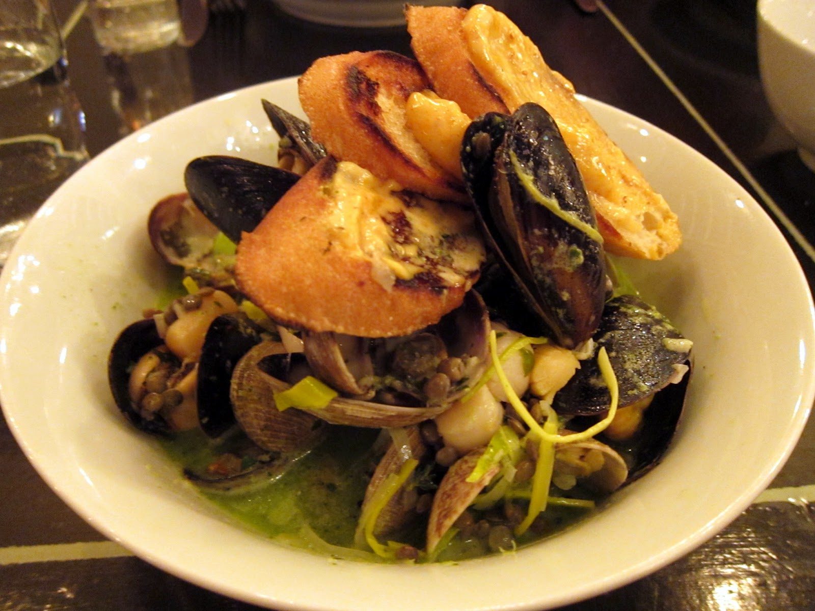 Moules Mariniere mediterranean mussels, manila clams, garlic cream bouillon, piment d’espelette, french green lentils, baguette toast, aïoli