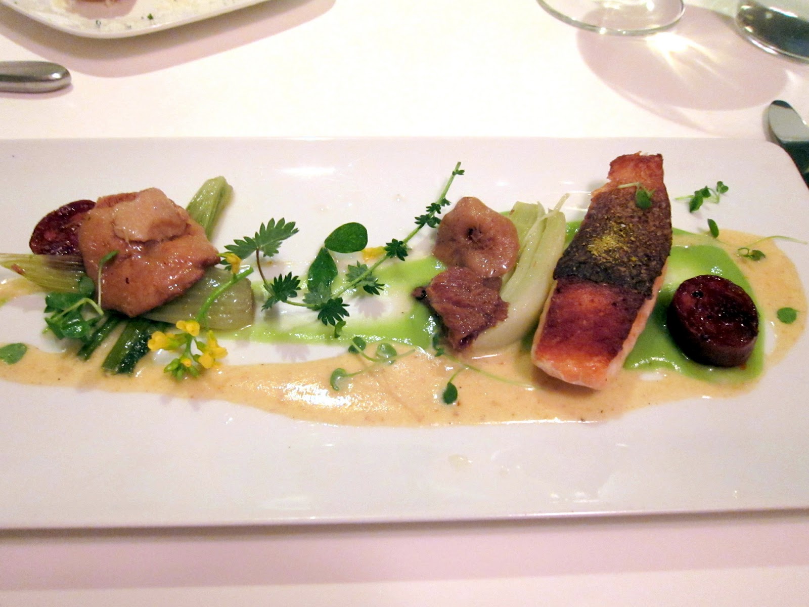 Spring Quinault River Salmon kholrabi puree, chorizo, fennel pollen, baby fennel, ras el hanout