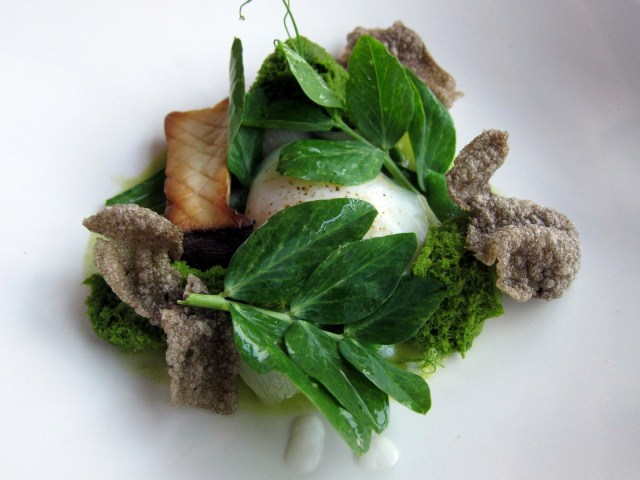 Slow Cooked Egg snap peas, mint bread pudding, mushroom cracker, green garlic broth