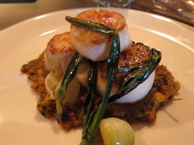 Seared Scallops romesco, young onions