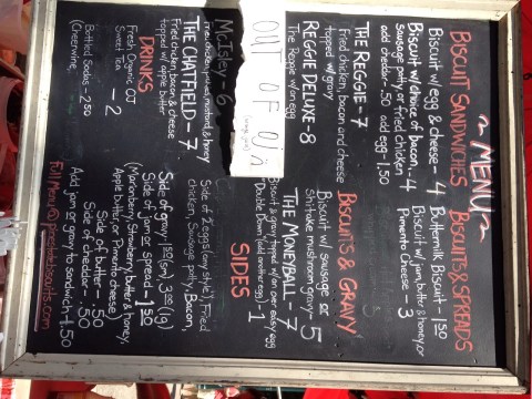 So this post marks a FIRST. I used my iPhone to take these pictures! You may have noticed, but I ain’t eating out as much these days. So I don’t just leave my camera in my purse anymore because it’s just too heavy even though it’s just a point and shoot. People rave about this place, but I’ve shied away from Pine State Biscuits because I heard the weekend brunch wait and be pretty horrendous and I’m not a fan of heavy greasy breakfast foods like biscuits slathered in gravy, cheese, etc. But when Quack Man T came to visit with his friends, he said this place was a must. Lucky for me, Pine State Biscuits is a regular at the weekend PSU Farmer’s Market AND the line wasn’t so long.
