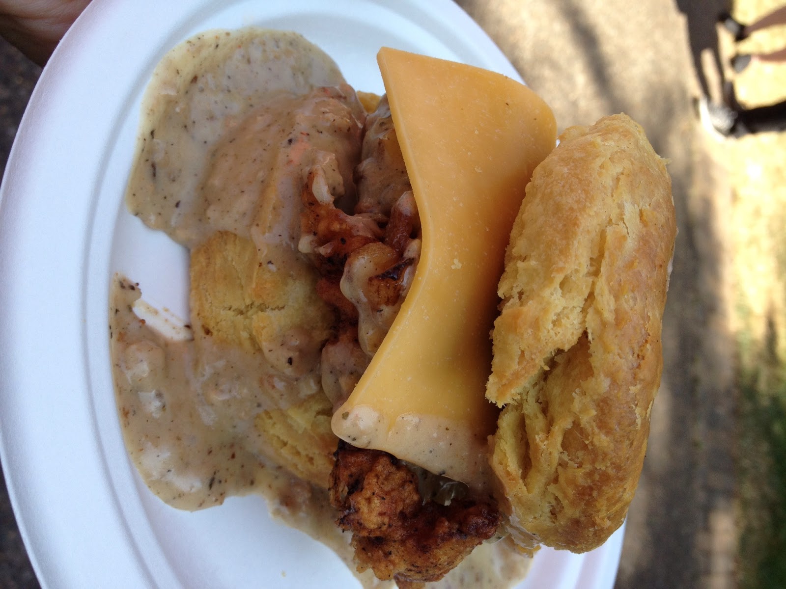 OK, it is pretty darn delicious. The biscuit is just the right amount of flakiness and butteriness. The chicken was crispy and moist. The bacon was smoky. I could have done without the cheese. The gravy was definitely made with a lot of love, not like that cafeteria gravy or the stuff that comes from powder. I wish there was more gravy because it got kinda dry in my mouth.