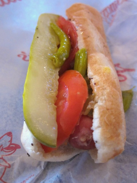 I really wanted to try Hot Doug’s or Franks ‘n Dawgs but they were just too far and Portillo’s happened to be a few blocks away while I was out with Dumpling Man and his old high school buddy, See Fut Gwai. Even though it was just 2 hours before our dinner reservations at Next, Dumpling Man and I wanted to see what all the rage was with Chicago and it’s hot dogs.