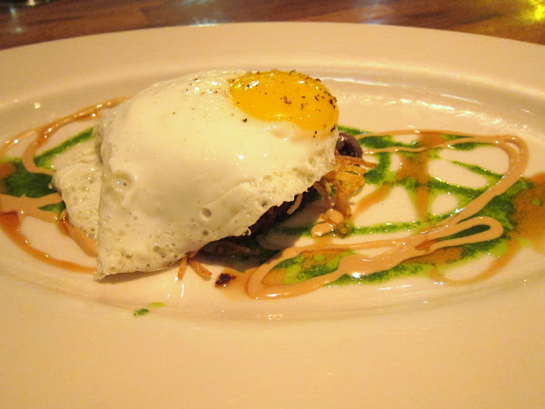 Wood Oven Roasted Pig Face sunny side egg, tamarind, cilantro, red wine-maple, potato stix