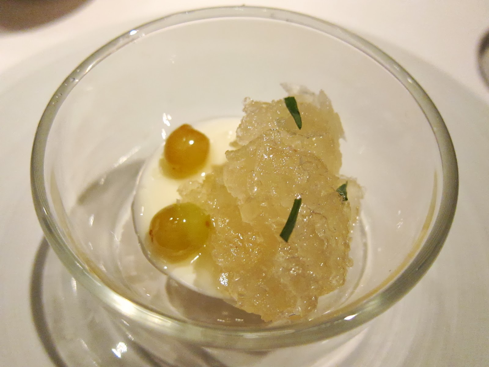 Even though the berries appear to be lacking in color and possibly underripened, they were so sweet! The lightly sweetened bit of mascarpone brought some delicate creaminess. The opaque irregular pieces are like lemony ice chips. Added a nice cool textural element.