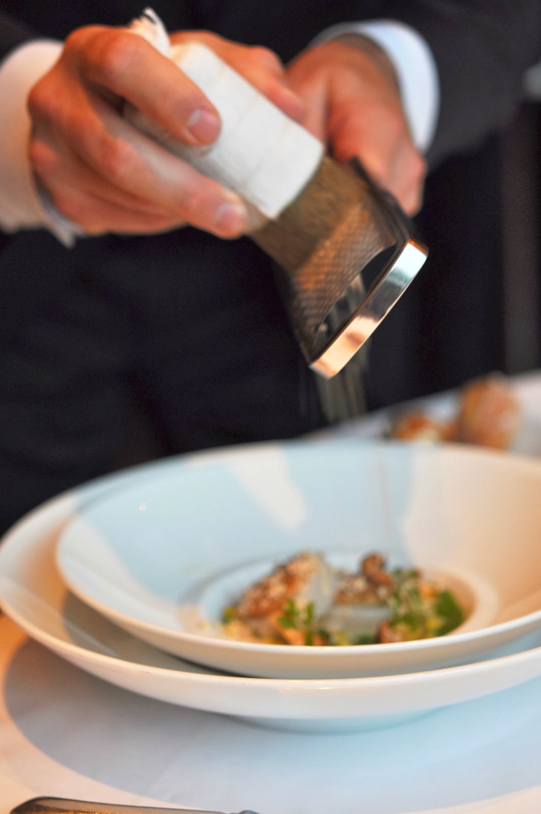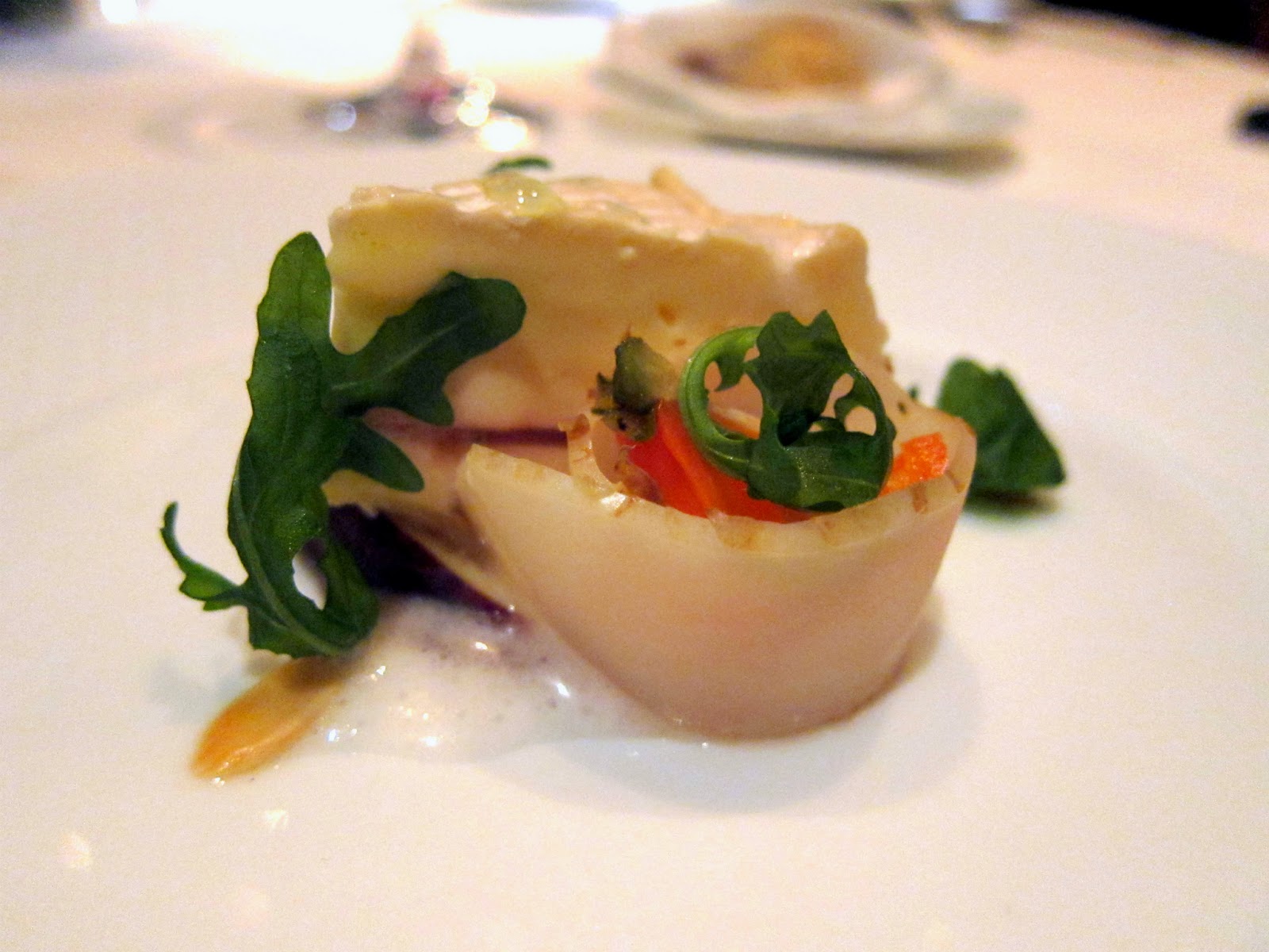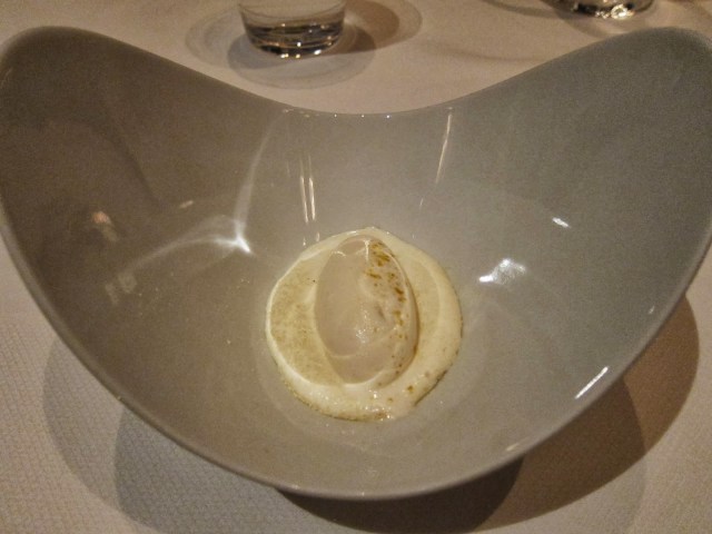 I love scallops, but this was a bit of a disappointing preparation. I’m used to seared scallops but I feel like these were sous vide or something like that because they had absolutely no color or caramelization. They appeared a bit grey and translucent, which was a bit off putting. They shaved a foie gras pastrami over the dish at tableside. I can’t say I really noticed much added flavor. Another minor complaint I had was that I wished the food was hotter. Things just tasted warm.