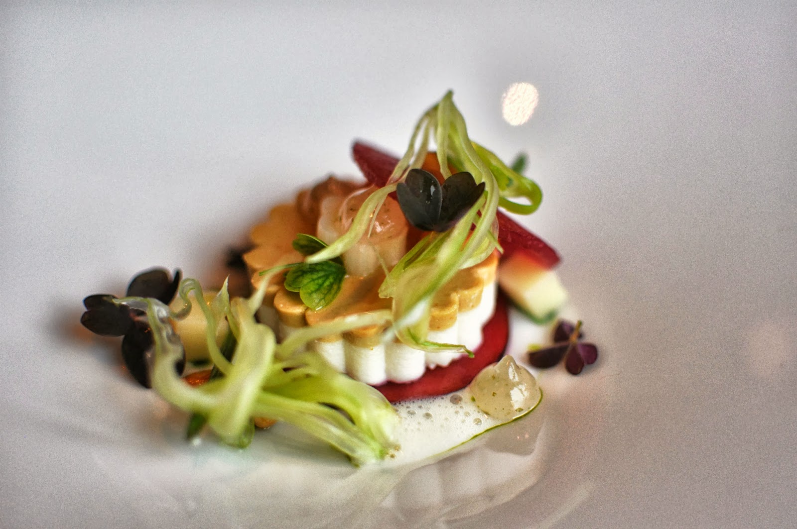 Hawaiian Hearts of Peach Palm Bavarois santa rosa plums, toasted cashews, sorrel, vadouvan curry